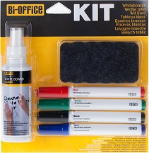 Комплектът от "Bi-Office" е снабден с всичко необходимо за вашите презентации. Той съдържа 4 броя маркери в различни цветове, флакон от 125 ml спрей за бяла дъска и гъба за почистване на бяла дъска, която е изключително удобна за закрепяне на дъската благодарение на прикрепеният за нея магнит.