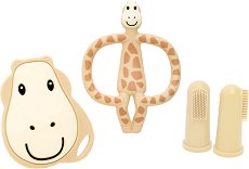 Бебешкият комплект на Matchstick Monkey включва най-необходимите аксесоари за грижата за венците и зъбките на вашето бебе. Той съдържа 2 гризалки и 2 броя накрайници за миене на зъби от мек и гъвкав силикон. Всички аксесоари са снабдени с антимикробна технология BioCote Antimicrobial Technology, която унищожава до 99.99% от микробите в рамките на 2 часа, така че да се поддържа добра хигиена. Гризалките са особено подходящи за успокоение на болката във венците при никнене на първите зъбки на бебето. Едната от тях е плоска, с форма на усмихнато личице на жирафче, като задната ѝ страна е с релефна повърхност за ... |