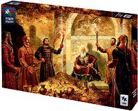 В дълбините на българската история, сред времето на владетели и герои, живее легендата за хан Кубрат - основателят на Велика България и символ на мъдрост, сила и единство. В последните си дни великият хан събира своите синове, за да им остави най-ценния си завет - да бъдат заедно, защото само тогава народът им ще бъде непобедим. Тази внушителна творба на художника Васил Горанов е вдъхновена от романа Сказание за хан Аспарух, княз Слав и жреца Терес на Антон Дончев и представя символичен прочит на последния завет на Кубрат. Топлите златни тонове, богатите детайли и изразителните лица на персонажите създават усещане за ... |