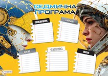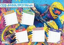 Ученическата седмична програма включва дните от понеделник до петък, както и отделение за учебната смяна. Към учебната програма са добавени и самозалепващи стикери с изучаваните през срока предмети. Така децата ще се забавляват докато подготвят новата си програма, която същевременно ще бъде и прегледна. Ученическата програма е формат A4 (с размери 29.7 x 21 cm). ...
