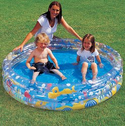 Хайде на море... в двора! Това е напълно възможно с компактния басейн от висококачествен винил на „ Intex “. Той е с квадратна форма (159 cm) и дълбочина 50 cm, а на сините му стени има изрисуван цял коралов риф. Широките странични стени на аква-атракцията повишават безопасността му. Басейнът е с три въздушни камери с двойни клапани (за надуване и спихване). Стените му са високи половин метър, а вместимостта му е 499 литра, при запълване на 80%. Дъното на съоръжението е подсилено, като на него, за удобство, има практичен клапан за изливане на водата. За да надуете най-бързо и лесно този продукт, ви е необходима помпа. ...
