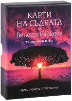Карти на съдбата е комплект от 50 специални карти и книжка с 64 страници с указания за работа с тях, в луксозна кутия. Книжката не се разпространява самостоятелно."Всеки човек има своя съдба, която сам е избрал още преди да се роди. Как да разберете къде ви води съдбата и в каква посока да поемете, когато сте на кръстопът или се колебаете в дадена ситуация? На помощ идват Карти на съдбата. Символите на тези 50 карти вече сте ги виждали на кориците на моите книги и като послания в сюжета им. Познавате ги, писала съм много за тях. Не ви трябва специална подготовка и обучение, за да ги накарате да ви служат. Изтеглете ...