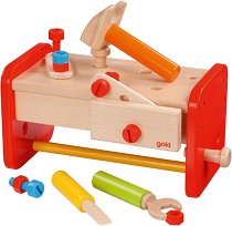 Вашият мъник иска да стане майстор и обича да помага във всички ремонтни дейности? Ако е така, комплектът на Goki е чудесен избор за подарък. Той включва куфарче, чукче, отвертка, гаечен ключ, винтове и болтове. Всички елементи са изработени от дърво и боядисани с безвредни бои на водна основа, подходящи за деца. Куфарчето служи не само за съхранение и пренасяне на инструментите, но може да се използва и като работна маса. Върху нея детето може да завинтва и отвинтва винтовете, болтовете и гайките, като развива фината моторика, координацията и въображението си чрез ролевата игра. Куфарчето е с приблизителни размери ... |