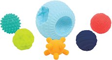 Занимателният комплект от LUDI ще привлича детското внимание със своя уникален дизайн и ярки цветове. Играта с него ще стимулира детските сетива и ще развива двигателните умения. Състои се от голяма топка, която има 5 вдлъбнатини с определена форма и 5 по-малки цветни топчета, които са различни на допир. Тази играчка е предназначена за ранно обучение, като развива паметта, логиката, така и фините двигателни умения на бебето. Малките топки са с размер ø 8 cm, а голямата топка с размер ø 15 cm. ... |