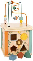 Дидактическият куб Сафари от Small foot е подходящ за деца над 1-годишна възраст. Той е изработен от дърво, боядисано с безвредни бои на водна основа и разполага с 5 различни активности за игра. Горната му страна се отваря като капак и може да се сваля. Всяка от страните на играчката представлява различна игра - въртящи се зъбни колела, лабиринт с дървени мъниста, форми за сортиране, въртележка с животни и още един лабиринт. Играчката ще помага на децата да развият фини двигателни умения, концентрация и координация на движенията. Дидактическият куб е с размери 20 x 38 cm. ... |