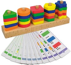 С комплекта за игра от "Andreu Toys" малчуганите ще могат да научат цветовете: жълт, зелен, син, оранжев и червен, както и формите: триъгълник, кръг, квадрат, шестоъгълник и цвете. Върху дървена основа има 5 пръчки за нанизване на елементите, а за да упражняват логическото си мислене, децата могат да следват инструкциите за подреждане, илюстрирани на 25 те двустранни карти. Приблизителните размери на основата са 31 / 11 / 7.8 cm. ...