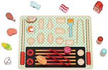 С комплекта от Tooky Toy вашият малчуган ще се почувства като истински готвач. Той се състои от елементи за сглобяване на барбекю, шишове, клечки, солници, бутилка с кетчуп и различни хранителни продукти. Компонентите са изработени от дърво, оцветено в ярки цветове. Детето ще може да приготвя вкусна храна за своите приятели, както и да използва шишовете, за да нанизва продуктите върху тях. А когато не готви, то ще трябва да постави елементите обратно на техните места. След като разгледа барбекюто, детето ще открие, че всеки хранителен продукт има точно определено отделение с името му. Така, докато играе, то ще развива ... |