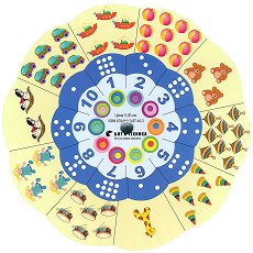 За деца на 5 - 6 години. ... Детето трябва да завърти трите диска така, че да съвпаднат броя на предметите, точките и числата. За самопроверка са предназначени трите малки кръгчета. При верен отговор цветовете им ще съвпаднат. Учебната система Златно ключе за 3. група на детската градина се състои от: комплект познавателни книжки познавателна книжка по български език и литература познавателна книжка по математика познавателна книжка по околен свят познавателна книжка по изобразително изкуство познавателна книжка по музика познавателна книжка по конструиране и технологии портфолио на детето ...