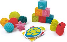 Комплектът от LUDI може да превърне моментите за баня в любима част от ежедневието на вашето дете. Той съдържа 6 кубчета, 6 топки, 2 играчки във формата на животни и книжка. С комплекта за баня вашето бебе ще се запознае с различни предмети, цветове, цифри, геометрични форми и животни. 6-те кубчета могат да се подредят едно върху друго или да образуват различни конструкции. Всяко една от 6-те топки е с различен релеф, за да стимулира усещането за допир, сръчността и координацията в движенията на бебето. Всяка една от играчките е направена с размери, съобразени с малките бебешки ръце. ... |