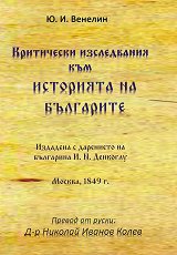 "В ръцете си държиш книгата на Ю. И. Венелин "Критически изследвания към Историята на българите". Това издание излиза 171 години след първото руско издание в превод на български. Книгата е писана преди 1839 г., когато нашият народ е забравен от света и е пред прага на загубване на собствената си национална идентичност. Само по себе си написването на книгата и нейното публикуване след смъртта на Венелин от родолюбеца Денкоглу през 1849 година са събития от огромно значение за българското просвещение." Д-р Николай Иванов Колев ...