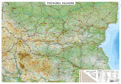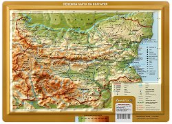 Релефната карта съдържа информация за: географска мрежа; държавни граници; релеф, представен чрез хипсометрично оцветяване; столици и основни градове; основни пътища; географско разпределение на полезни изкопаеми на територията на България; легенда. Хоризонтален мащаб на картата: 1:1 000 000. Вертикален мащаб на картата 1:150 000. Релефната карта е с размер: 42 x 54.5 cm. ... |