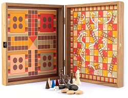 За почитателите на класическите игри от "Manopoulos" предлагат луксозен комплект, който ще бъде подходящ подарък за тях независимо от повода. Той се състои от кутия с основа за игра на "Шах", "Табла", "Не се сърди човече" и "Змии и стълби", дървени фигури за шах и дама, и пластмасови зарчета. Кутията е изработена от висококачествен дървен материал и в отворено състояние е с размери 34 x 68 cm. От вътрешната и външна страна кутията има игрални полета за 4 различни игри. ... |