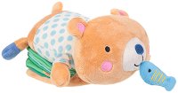Мечето на Фют е изработено от мека и приятна на допир материя. На коремчето му е прикрепена текстилна книжка, състояща се от 6 страници с картинки. Една от тях издава жужащи звуци, което е интересно за малките деца и привлича вниманието им. Рибката, прикрепена на устичката на мечето, също добавя интерактивен елемент, тъй като го разклаща при всяко подръпване, предоставяйки допълнителна забавна игра. Тези характеристики правят играчката не само занимателна, но и полезна за развитието на слуховите и моторни умения на детето. Книжката е подходяща както за забавление и игра през деня, така и като мека играчка за гушкане ... |