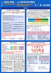 Съставител: Дочка Кючукова. ... Справочникът представя кратко, прегледно и систематизирано в цветен табличен вид най-важното от съдържанието по математика за 1. клас, 2. клас, 3. клас и 4. клас. Учебното помагало е полезно за усвояване на нови знания при работа в час, за подготовка по часовете по математика, за подготовка Националното външно оценяване. Съдържа цветни справочни таблици, чертежи, определения, свойства, формули и правила, подкрепени с примери, алгоритми за решаване на основни текстови задачи и друга полезна справочна информция по математика. Страниците на справочника са двустранно ламинирани и годни ... |