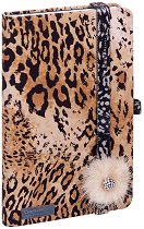 Луксозният бележник "Lanybook" от колекция "Wild cat" е леопардов мотив и ластична лента за затваряне с пухче с кристали Swarovski. Технически специфики на тефтера: размери: 9.5 x 14.5 cm; твърди корици със леопардов мотив; брой страници: 192; хартия - бяла, 80 gr.; широки редове; огледало върху предната вътрешна корица; разделителна лента; заоблени ъгли; ластична лента за затваряне с пухче с кристали Swarovski; ластик - държач за молив или химикалка; джоб за съхранение на бележки върху задната вътрешна корица. ...