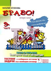 Тестове с избираем отговор. Задачи със свободен отговор. Помагалото е одобрено със Заповед № РД 09-244/05.03.2015 г. на министъра на образованието и науката. ... Сборниците "Браво!" по български език и литература са създадени по молба на преподаватели в начална образователна степен. Те съдържат специално създадени художествени текстове, написани с доказан творчески и методически професионализъм от Наталия Огнянова. Част 9 съдържа над 66 литературно-езикови задачи и подзадачи, изискващи свободен отговор, и 80 тестови задачи с избираем отговор. Оценяването е изведено в мотивационна форма, щадяща психиката на ... |
