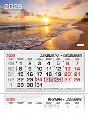 Характеристики на календара: 3 тела от 12 листа - на всеки лист по 1 месец (основен, предходен и предстоящ месец); фази на луната; имени дни; църковни празници; официални празници; съкращения на държавите, които честват свой празник на дадената дата; прозорче с ластици. ... |