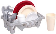 Какво е нужно на една домакиня, за да обзаведе кухнята си? Прибори, чинии и чаши, разбира се. Комплектът от "Klein" се състои от 2 големи и 2 малки чинии, 2 чаши, 2 лъжици, 2 вилици, 2 ножа и сет за кафе - 2 чаши за кафе с 2 чинийки и 2 лъжички. Всичко това е прибрано в сушилник за чинии, който има и приставка за добавяне в детска миялна машина. Комплектът е съвместим с някои детски кухни на марката. Дължината на продукта е 24 cm. ... |