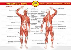 Таблото е с формат А4. Учебното табло съдържа информация за анатомията на човешкото тяло: мускули костна система кръвоносна система ... |