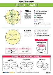 Учебното табло "Ротационни тела. Сфера, кълбо" е ламинирано, с лайсни и въже за закачане. Таблото е с размери 70 x 100 cm и е двустранно. Учебното табло съдържа информация за: сфера; кълбо; сечение; взаимно положение на две сфери. ... |