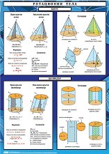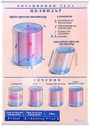 Учебното табло "Ротационни тела. Цилиндър и конус" е ламинирано, с лайсни и въже за закачане. Таблото е двустранно, с размери 70 x 100 cm. От едната страна на таблото са изобразени пресечен конус, елементи (височина, образуваща, радиуси, основи), сечения, формули за лице на околна повърхнина, лице на пълна повърхнина и обем. От другата - сфера, елементи (център, радиус, хорда, диаметър и голяма окръжност на сферата), сечения, формули за лице на повърхнина и обем при сфера, сферичен сегмент и сферичен слой. ... |
