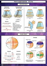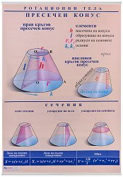 Учебното табло "Ротационни тела. Пресечен конус и сфера" е ламинирано, с лайсни и въже за закачане. Таблото е двустранно, с размери 70 x 100 cm. От едната страна е изобразен пресечен конус, елементи (височина, образуваща, радиуси, основи), сечения, формули за лице на околна повърхнина, лице на пълна повърхнина и обем. От другата - сфера, елементи (център, радиус, хорда, диаметър и голяма окръжност на сферата), сечения, формули за лице на повърхнина и обем при сфера, сферичен сегмент и сферичен слой. ... |
