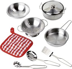 Вашето дете мечтае да стане велик готвач? С комплекта от съдове за готвене на Goki то ще се приближи до изпълнението на своята мечта. Той се състои от тенджера с капак, тиган, гевгир, купа, шпатула, решетъчна лъжица, лъжица за спагети и кухненска ръкохватка. С тях малчуганите ще могат да "сготвят" своите любими ястия и да измислят собствени рецепти. Елементите са изработени от метал, благодарение на което ще могат да се използват за дълго време, а ръкохватката е текстилна. За да е по-забавна играта, можете да закупите и различни фигурки на плодове, зеленчуци и месни продукти, които детето да "сготви". ... |