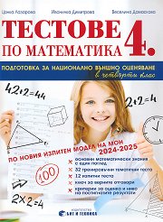 Помагалото е предназначено за целогодишна подготовка на учениците в 4. клас за националното външно оценяване по математика. Помагалото е преработено, съобразно новия модел на МОН от септември 2024 година. То предлага 12 тренировъчни теста в 2 варианта и 8 контролни теста. Всеки съдържа по 25 задачи. Тренировъчните тестове са разпределени в 6 теми. Предложеният учебен материал в тях е съобразен с последователността на темите от учебната програма. В Картата на успеха след всеки тренировъчен тест ученикът може да отбелязва резултата си и да се самооценява, а родителите имат възможност да проследяват неговия напредък. ... |