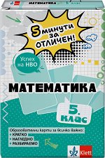 Успех на Националното външно оценяване. Комплектът съдържа 32 образователни карти, обхващащи най-важния материал по математика за 5. клас - кратко, нагледно, разбираемо. Част е от учебно-помощната система 5 минути за отличен на издателство Клет България за бързо и лесно усвояване, затвърдяване и преговор на наученото, както и в подготовката за изпити и тестове. Картите са с размери 21 x 14.8 cm. ... |