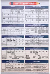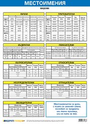 Учебното табло "Местоимения" е ламинирано, с лайсни и въже за закачане. Таблото е с размери 70 x 100 cm. Таблото "Местоимения" съдържа информация за: лични местоимения; притежателни местоимения; възвратни местоимения; показателни местоимения; въпросителни местоимения; относителни местоимения; неопределителни местоимения; отрицателни местоимения; обобщителни местоимения. ... |