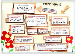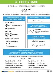 Учебното табло "Степенуване" е ламинирано, с лайсни и въже за закачане. Таблото е с размери 100 x 70 cm, съдържащо информация за свойствата и образуването на степени, както и определения и важни правила. ... |