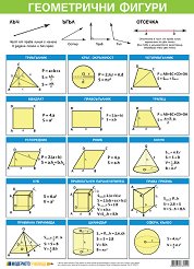 Учебното табло "Геометрични фигури" е ламинирано, с лайсни и въже за закачане. Таблото е с размери 70 x 100 cm. В таблото ще откриете информация за: триъгълник; кръг, окръжност; четириъгълник; квадрат; правоъгълник; трапец; успоредник; ромб; конус; куб; правоъгълен паралелепипед; права призма; правилна пирамида; цилиндър; сфера, кълбо. ... |
