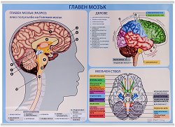 Учебното табло "Главен мозък" е ламинирано, с лайсни и въже за закачане. Таблото е с размери 100 x 70 cm. На таблото са изобразени: Главен мозък (разрез) Ляво полукълбо на Големият мозък Дялове Мозъчен ствол ... |