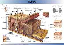 Учебното табло Кожа от Учмаг е изработено от винил, има широки вътрешни лайсни от здрав материал и е лесно за сгъване и показване, като предлага отлична видимост, без отражения на светлината. То представя детайлно структурата на кожата - епидермис, дерма, подкожие. Показани са мастните и потните жлези, нервните рецептори (за натиск, болка, студено и топло), кръвоносни съдове, космени фоликули и др. Представена е структурата на косъма и човешките отпечатъци и е сравнена млада и старееща кожа. Таблото е с размери 100 x 70 cm. ... |