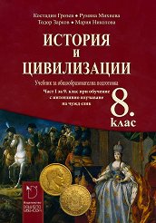 1 част за 9. клас при обучение с интензивно изучаване на чужд език. ... Учебното съдържание в учебника по История и цивилизации за 8. клас обхваща периода Новото време - Модерна история. Преходът от Великите географски открития до навечерието на Първата световна война е разгърнат съдържателно в 32 урочни статии, предназначени в по-голямата си част за 2 учебни часа. Предимството на този модел е, че дава възможност учениците не само да се запознаят, а и да овладеят съзнателно логическите и причинно-следствените връзки в историческите събития и явления. Времето е достатъчно за спокойна актуализация на наличните знания, ... |