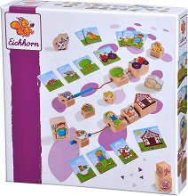 Комплектът от Eichhorn е подходящ за деца над 2-годишна възраст. Той се състои от 2 връзки с фигурки в единия край - трактор и обор, а също така 11 фигурки за нанизване и 11 карти с картинки. Елементите са изработени от дърво, боядисано с безвредни бои на водна основа. Целта е детето да подреди картинките от картите в ред по желание, а след това да се опита да подреди по същия начин фигурките на връзките. Това простичко занимание има за цел да развива детската координация, памет, цветоусещане и фина моторика. Етикетът FSC е най-довереният знак в света за устойчиво горско стопанство. Когато купувате продукти с ... |