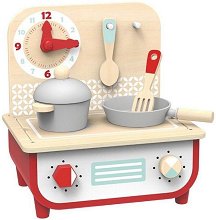 Детският комплект от "Tooky Toy" е специално създаден за малките готвачи! Той е подходящ за малчугани над 3-годишна възраст и се състои от котлон със сменяем плот, тиган, тенджера с капак, лъжица, вилица, шпатула, щипки, 2 шишчета и фигурки за "готвене". Елементите са изработени от пластмаса и дърво, боядисано с безвредни бои на водна основа. Котлонът е лек и разполага с въртящи се бутони, часовник и закачалки за лъжицата и вилицата. А за да се превърне от котлон в барбекю, е достатъчно да обърнете плота му наобратно и да махнете часовника. Фигурките могат да се съхраняват удобно в задната част на ... |