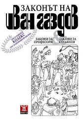 Постсериозен кодекс със затихващи функции. Закони за професори. Закони за студенти. ... "Сега, след първата си книга (съдържаща някои от лекциите на автора за плаката, понеже пък той именно по това е и професор), Иван Газдов прави всенародно достояние пет закона за професори и други пет за студенти. Към тях е додал и един "Закон за съвършеното творческо формообразуване (неръкотворно), или за разликата между изкуството и живота". И всичко това е снабдено с десетки графични диаграми, схеми и чертички, напомнящи най-добрите образци на някогашните Газдови цикли за петното, което срещнало чертичката, а ... |