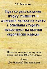 Препис: Д-р Николай Иванов Колев. ... "Драги читателю, В ръцете си държиш книга на Г. С. Раковски, публикувана за първи път преди 162 години и никога непреиздавана досега! В тази книга Раковски публикува за първи път в света съпоставка на българския със самскритския език и стига до извода, че огромно количество коренни думи са еднакви, както в българския така и в самскритския и имат същото значение. Това го води до извода, за древния произход на българския език, и за влиянието, което той е оказал на другите езици. Удивителен е преводът на цели самскритски изречения, с помощта на българския, говорен по негово време. ... |
