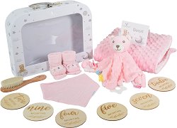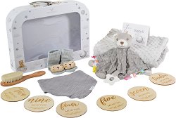 Бебешкият комплект Bearli на Cangaroo е внимателно подбран за нуждите на новороденото. Той съдържа меко двулицево одеяло, играчка за гушкане – мече, лигавник тип бандана, чорапки, четка за коса и дървени плочки с надписи. Одеялото е с размери 100 x 80 cm и е изработено от изключително мека материя, нежна към бебешката кожа. Едната страна е с релефна текстура, която създава допълнителен комфорт и успокояващо усещане. Подходящо е както за повиване, така и за използване в бебешкото креватче или количка по време на ежедневни разходки. Включената в комплекта играчка за гушкане ще донесе радост и спокойствие на вашето ... |