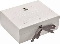 Кутията за спомени е част от колекцията Bambino, в която ще откриете още бебешки и детски продукти по темата. ... Кутията за спомени на Widdop Bingham е стилно и практично решение за съхранение на най-ценните спомени от първите месеци на вашето бебе. Изработена е от твърд картон, а капакът ѝ е декориран с нежни звездни мотиви и посребрена фигурка на мече, инкрустирана с кристалче. Декорацията е допълнена от сребристия сантиментален надпис Sometimes the littlest things take up the most room in your heart (Понякога най-малките неща заемат най-голямо място в сърцето ти). Капакът се затваря със сатенена панделка, ... |