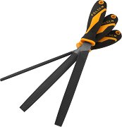 Пилите на Premium са подходящи за прецизно и ефективно обработване на метал. Изработени са от високовъглеродна закалена стомана Т12 с твърдост 60 HRC, което им осигурява устойчивост на износване и дълготрайност. Имат ергономични дръжки с отвори за закачане за комфорт при употреба и лесно съхранение. Комплектът включва плоска, полуобла и обла пила с дължина 20 cm. ...