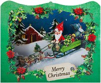 3D картичката на "Gespansterwald" е изработена от луксозен картон. Формите и фигурите са изрязани с лазер на 4 слоя, като последният е фон на картичката. На гърба има специално определено място за надписване. Картичката е с изключително празничен дизайн - зимен пейзаж, Дядо Коледа и шейна. Подходяща е за Коледен или Новогодишен подарък когато искате да изразите благодарност и внимание към любими хора. Картичката може да бъде поставена в подаръчна торбичка или кутия. Тя е с размери 13.4 / 11 / 4 cm, с включен цветно отпечатан плик. ... |