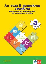 За деца на 5 - 6 години. ... Методическото ръководство на учителя по музика съдържа годишно разпределение по образователно направление "Музика" и примерни песни, музикални игри и нотен материал за изучаваните песни. Учебно-помощната система "Аз съм в детската градина" за 3. група на детската градина на издателство "Изкуства" се състои от: детско портфолио + 3 познавателни книжки помагало "Хартиени вълшебства" помагало "Музиката в детския свят" помагало "Пъстро календарче" помагало по логопедия "Моята звукотека" методическо ръководство на ... |