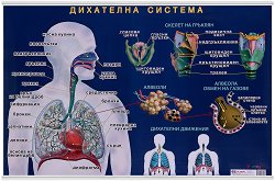 От органите на дихателната система гръклянът (larynx) има най-сложен строеж. Той не е само част от дихателните пътища, но и орган на гласообразуването - удивителен музикален инструмент. Разположен е в предната част на шията. На табло "Дихателна система" са представени: анатомията и на другите органи, съставляващи дихателните пътища; на белите дробове; газовата обмяна; механизмът на дишането. Табло включващо схеми на дихателната система на човека, алвеоли, обмен на газовете, дихателни движения, скелет на гръклян. Учебното табло "Дихателна система" е ламинирано, с лайсни и въже за закачане и е с размери ... |