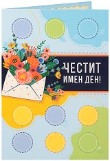 Това е персонална скреч картичка за имен ден - направи си сам: върху лицевата си страна картичката има надпис Честит имен ден, който е заобиколен от 9 кръгчета; в комплекта има 9 на брой скреч стикера; във всяко едно от кръгчетата напишете вашите пожелания или предизвикателства; след това върху всяко едно кръгче залепете по един скреч стикер. Поздравителната скреч картичка - Честит имен ден: ви позволява да напишете 9 пожелания, предизвикателства или изненади, които да скриете под скреч покритие и по този начин да приповдигнете още повече любопитството на празнуващия; може да се използва и като персонализиран ... |