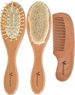 Комплектът на Cangaroo съдържа 2 бебешки четки за коса и гребен, които са подходящи за новородено и ще предоставят първа грижа за деликатните бебешка коса и скалп. Четките са изработени от здрава букова дървесина, като едната четка е с кози влакна, които са меки и неинвазивни за деликатния скалп на новороденото, в периода на премахване на крустите. А другата четка с бамбукови пинчета нежно разресва косата, идеална е за масаж на главата насърчавайки растежа на косата, като същевременно не предава статично електричество. Четките са снабдени с връзки за закачане и удобно съхранение. Бебешкият гребен е изработен от крушово ... |