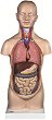 Анатомичният модел може да се използва за упражнения в часовете по биология. Учениците могат да изучават дихателната, храносмилателната и сърдечно-съдовата система. Органите са номерирани и имат подвижни части. Стомашно-чревният тракт се състои от стомах, черен дроб с жлъчен мехур, дебело и тънко черво. Той има подвижна клапа при апендикса. Дихателната система включва ларинкс, трахея и бели дробове. Между ларинкса и трахеята е разположена щитовидната жлеза. Около врата са илюстрирани кръвоносни съдове. Сърдечно-съдовата система е представена от артерии и вени, които изнасят и внасят кръв към сърцето. Учениците могат да ... |