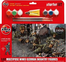 Комплект от 6 мащабно умалени фигури от пластмаса на германска пехота. Брой части: 102. Средна височина на една фигура: 55 mm. Мащаб на модела: 1:32. ... |