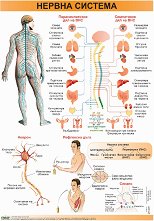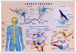 Табло, обозначаващо 31 сегмента на гръбначния мозък, всеки с по 1 чифт гръбначно-мозъчни нерви, неврон, връзка между два неврона, устройство при напречен пререз на гръбначен мозък, рефлексна дъга - илюстрации, предназначени за теми, свързани с анатомия на човека във всеки клас, еволюция на организмите, предаване на нервния импулс, устройство и функции на гръбначния мозък, тъкани,нервна дейност. Учебното табло е ламинирано, с лайсни и въже за закачане и е с размери 100 x 70 cm. На таблото са изобразени: неврон синапс пререз на гръбначен мозък рефлексна дъга ... |